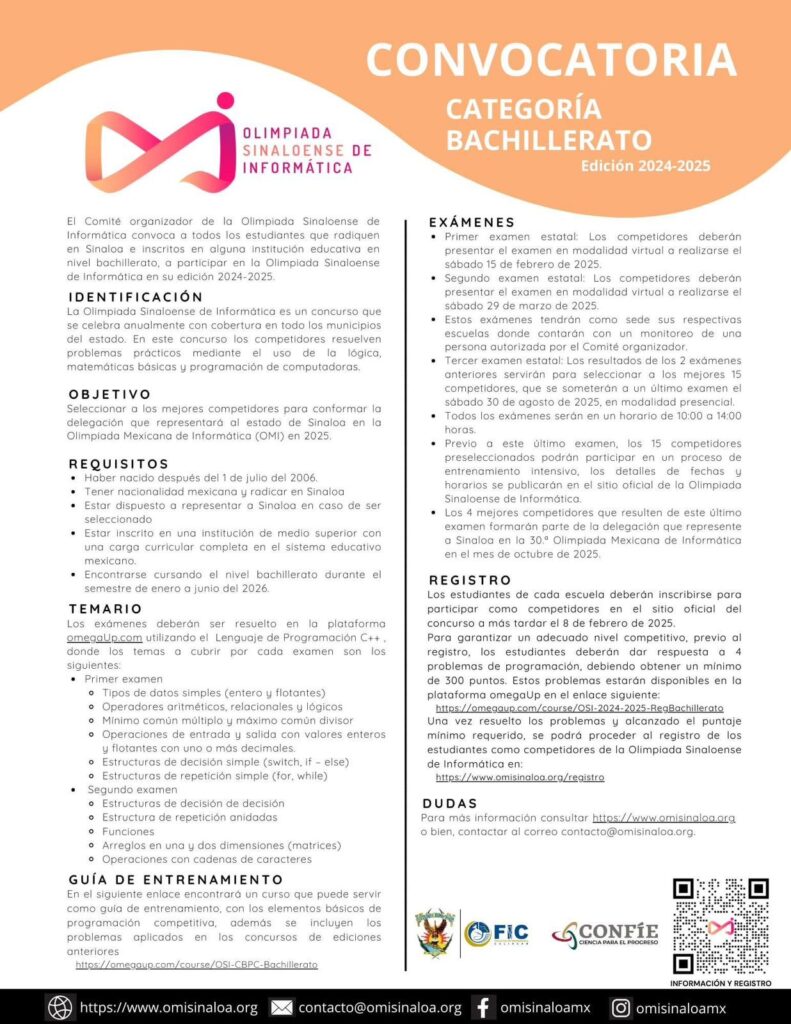 La coordinadora estatal del área de informática de la DGEP de la UAS manifestó que para esta Olimpiada se está trabajando mucho en la formación de los jóvenes y se estará llevando a cabo a partir del mes de febrero, toda vez que incluye tres etapas, dos que se llevan a cabo de forma virtual y en la última se eligen a los 15 mejores competidores para que presentaran un tercer examen, pero ya de forma presencial y que será en la Facultad de Informática Culiacán en el mes de agosto.