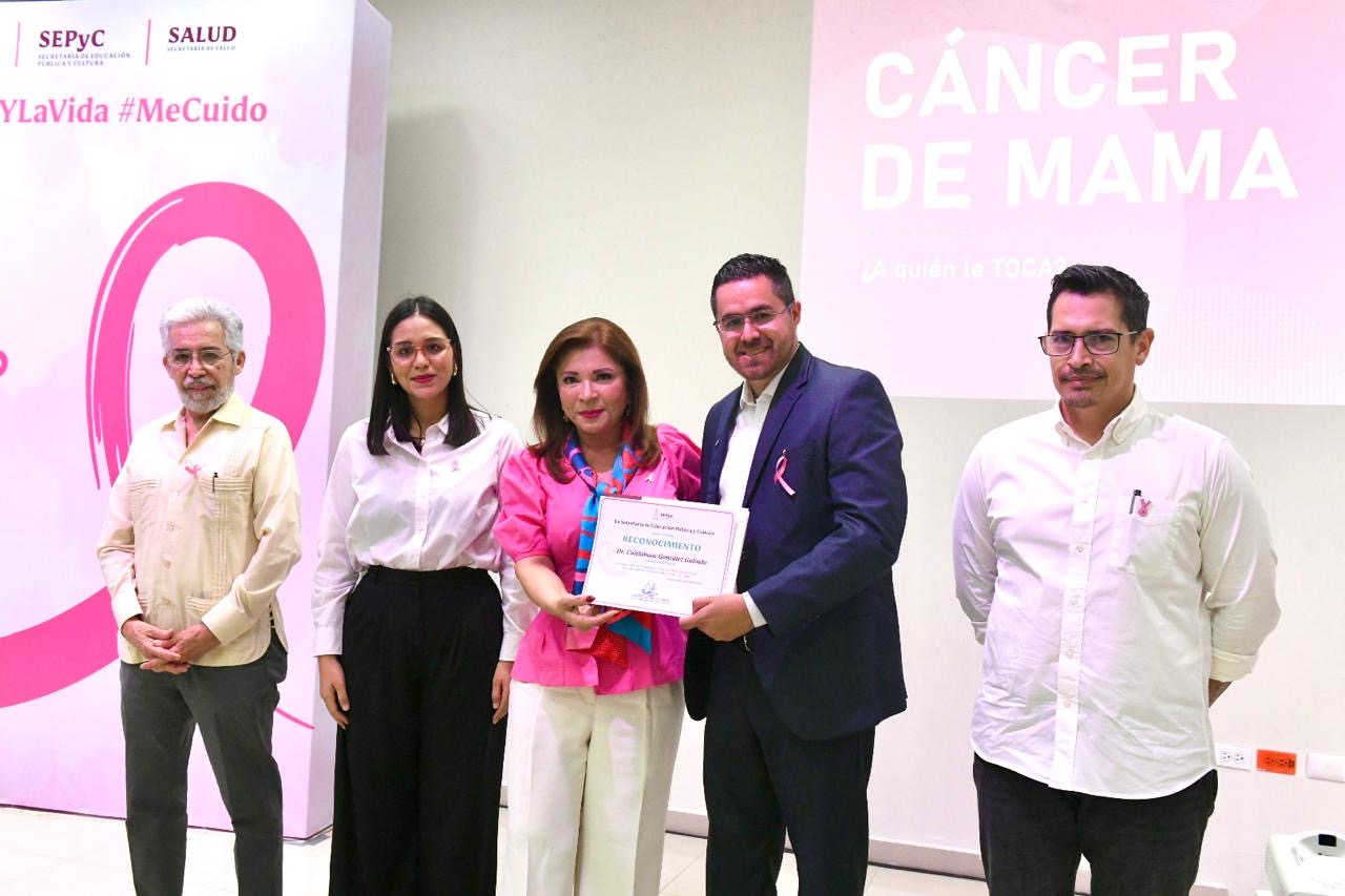 Culiacán, Sinaloa.- Cuando el cáncer de mama se detecta a tiempo no es grave, pero si no se hace los daños al núcleo familiar son inmensos, expresó la Lic. Gloria Himelda Félix Niebla, secretaria de Educación Pública y Cultura, al término de la conferencia magistral “Cáncer de mama: ¿a quién le toca?”, sustentada por el Dr. Cuitláhuac González Galindo, secretario de Salud y Director General de los Servicios de Salud de Sinaloa, ante trabajadores y trabajadoras de la SEPyC.