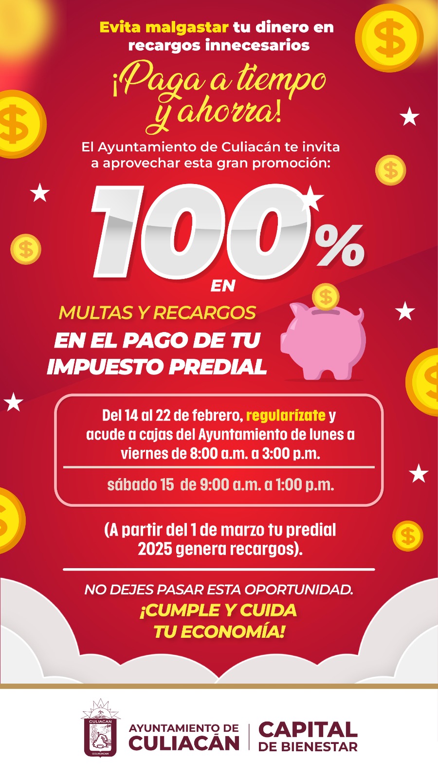 Culiacán, Sinaloa.- El Ayuntamiento de Culiacán ha lanzado una promoción especial para todos los contribuyentes: del 14 al 22 de febrero, podrás regularizar tu impuesto predial sin pagar multas ni recargos.