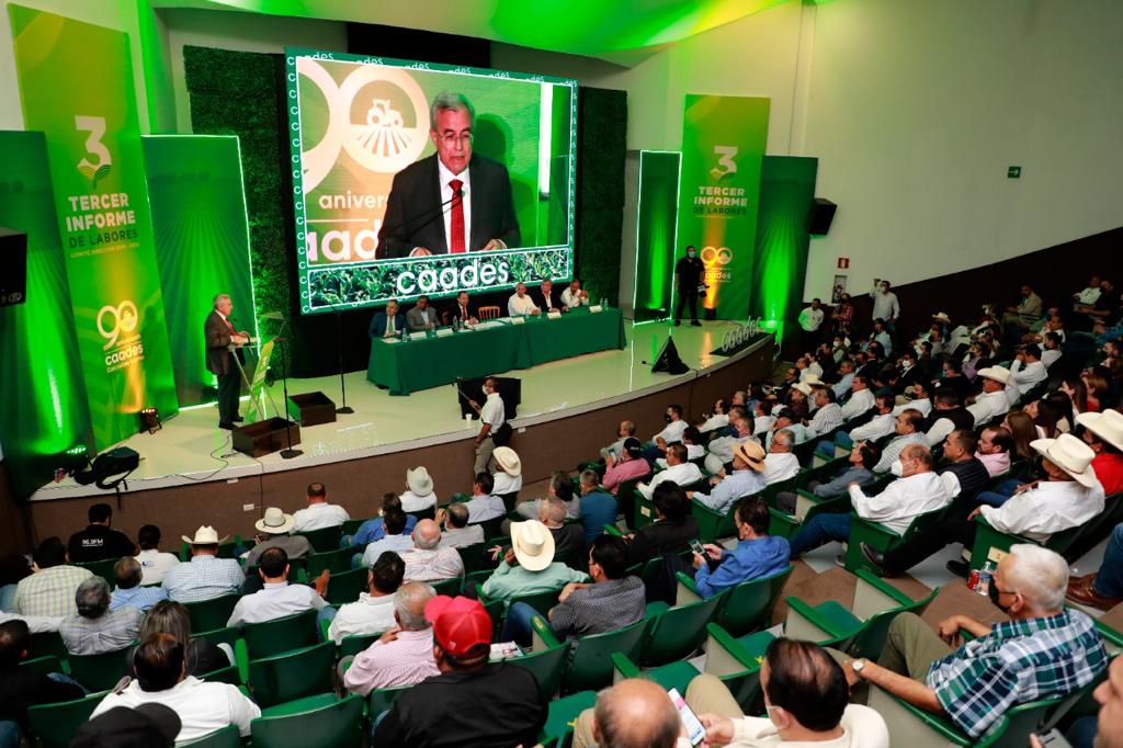 El mandatario estatal asistió acompañado por el secretario de Agricultura y Ganadería, José Jaime Montes Salas, a esta ceremonia donde Gustavo Rojo Plascencia rindió su tercer y último informe de labores al frente de la Confederación de Asociaciones Agrícolas del Estado de Sinaloa (CAADES) y tomó la protesta a su relevo, Marte Vega Román y al nuevo Consejo Directivo.