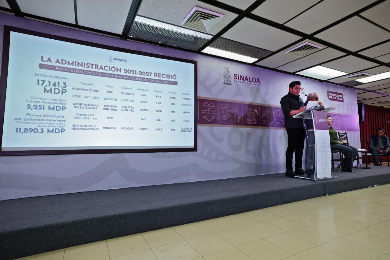 Culiacán, Sinaloa.- Durante la Conferencia Semanera del gobernador Rubén Rocha Moya, el secretario de Administración y Finanzas, Joaquín Landeros Guicho, informó que la presente administración estatal recibió una deuda heredada principalmente de los gobiernos de Mario López Valdez y de Quirino Ordaz Coppel, por un monto de 17 mil 141 millones de pesos, que se compone por 11 mil 890 millones de retenciones no enteradas, que no tienen fuente de pago, más los 5 mil 251 millones de pesos de deuda a largo plazo.