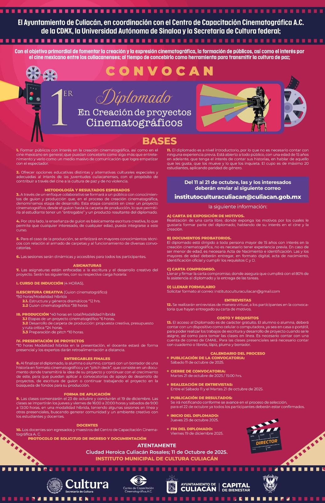 Culiacán, Sinaloa.- Con el propósito de fomentar la formación cinematográfica y fortalecer el interés por el cine mexicano entre la población culiacanense, el Ayuntamiento de Culiacán, en coordinación con el Centro de Capacitación Cinematográfica A.C. de la Ciudad de México, la Universidad Autónoma de Sinaloa y la Secretaría de Cultura federal, lanzó la convocatoria al Primer Diplomado en Creación de Proyectos Cinematográficos.