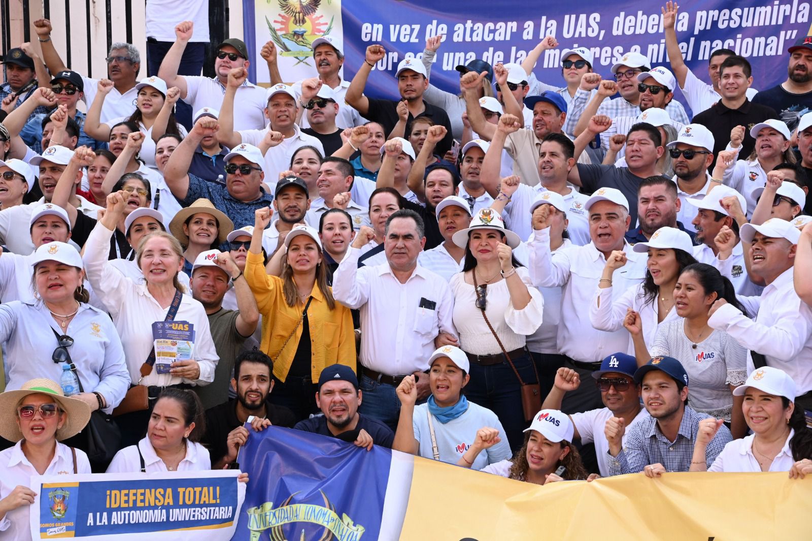 “Me siento muy motivado y lo he dicho: si los universitarios no se rajan yo no me voy a rajar, yo voy a seguir de frente tope lo que tope, decirles que vamos a resistir lo que tengamos que resistir por defender la Autonomía Universitaria (…), les pido que sigamos de pie, de frente, que no descansemos hasta lograr la victoria, porque la victoria va a ser de la Universidad Autónoma de Sinaloa así que de pie, de frente, con la frente en alto porque no tenemos nada de qué avergonzarnos, viva la UAS”, exclamó.