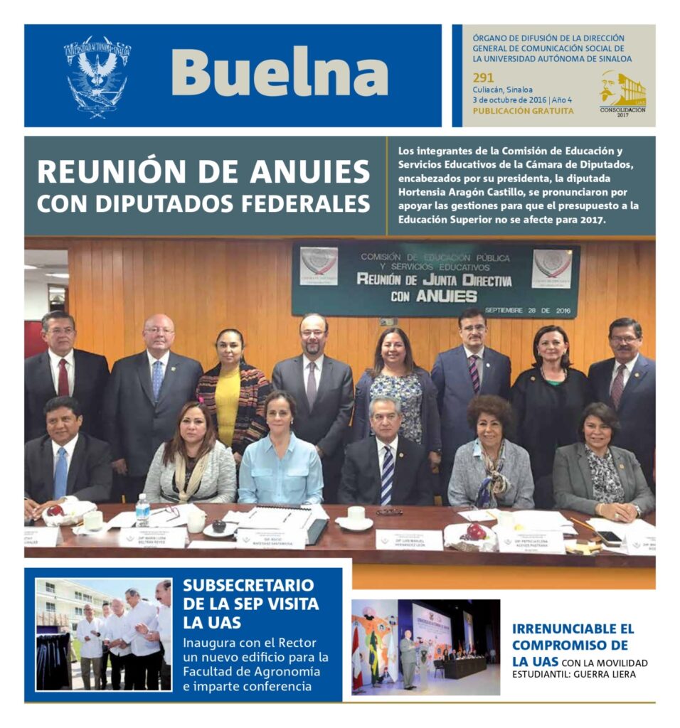 Es muy importante decir que el Periódico Buelna es el diario oficial de la Universidad Autónoma de Sinaloa, todo lo que ocurre está documentado y debidamente registrado en sus páginas, hoy que llegamos a los 600 ejemplares, pues me da mucho gusto poder estar dando testimonio de lo que se está haciendo en la universidad a través de estas páginas, que muchos universitarios y la sociedad en general lo esperan para conocer lo que ocurre en la universidad, expresó el Director General de Comunicación Social de la institución, el ingeniero Arnoldo Valle Leyva.