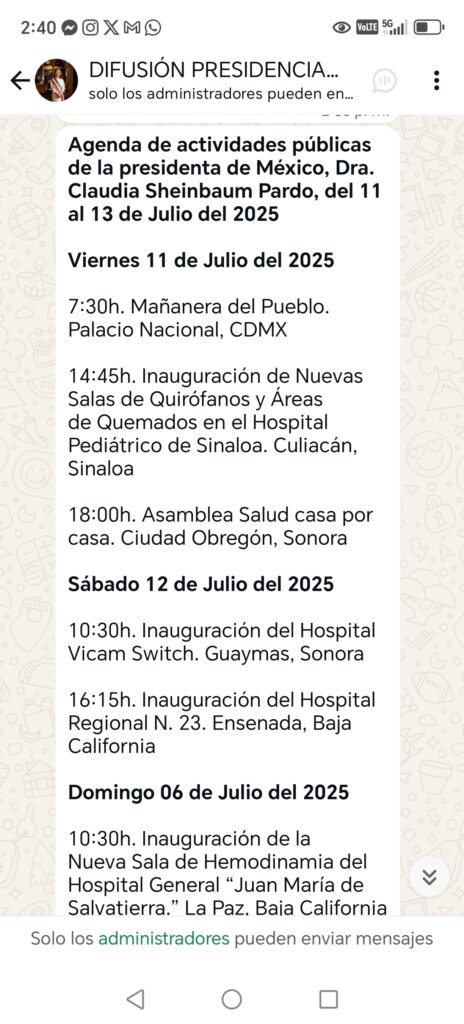 La aagenda de Sheinbaum Pardo fue enviada a los medios nacionales hace unos minutos, según detalla después de la conferencia la Mañanera del Pueblo, la presidenta volará a suelos sinaloenses, posterior de Culiacán viajará a Ciudad Obregón en Sonora para realizar asambleas de salud casa por casa