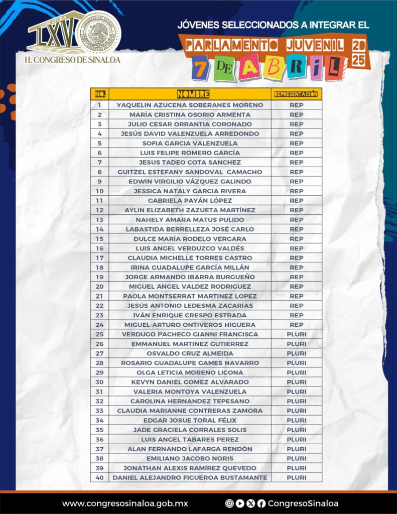 Culiacán, Sinaloa.- Con mayoría de votos, las y los integrantes del Comité Organizador, eligieron a las y los 40 jóvenes que fungirán como diputados y diputadas en el “Parlamento Juvenil 7 de Abril 2025”, organizado por el Congreso del Estado.