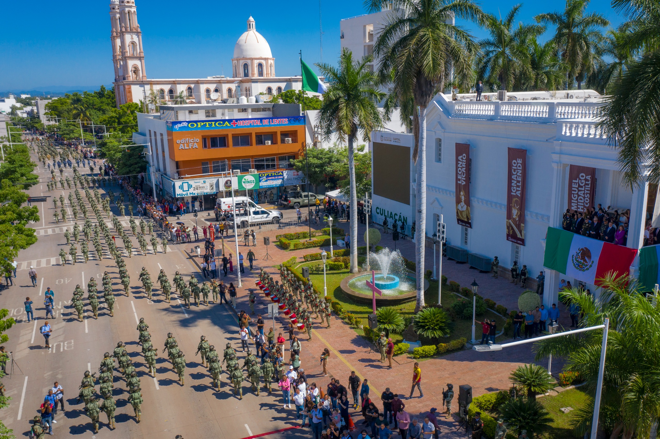 Culiacán, Sinaloa.- Con un impresionante despliegue de fuerza, se conmemoró el 214 Aniversario de la Independencia de México con el tradicional desfile militar sobre la avenida Álvaro Obregón en la capital sinaloense.
