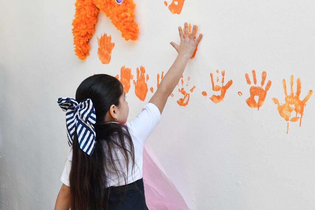 Además, los pequeños formaron parte de la creación del mural colectivo «ÚNETE», donde plasmaron la silueta de sus manos y escribieron mensajes de apoyo y aliento a las víctimas de violencia, generando un espacio simbólico de reflexión y compromiso.