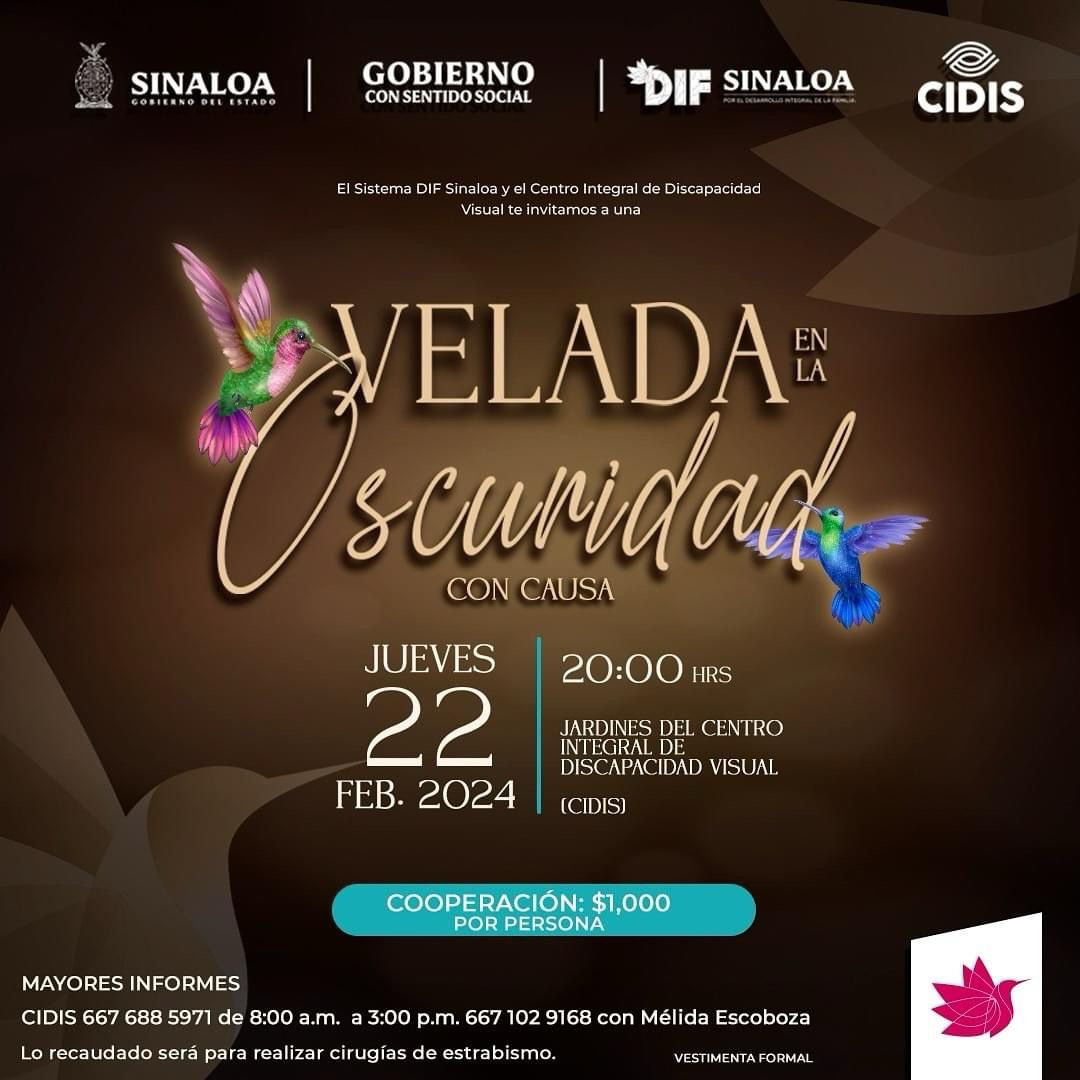 Culiacán, Sinaloa.- El Sistema DIF Sinaloa en conjunto con el Centro Integral de Discapacidad Visual (CIDIS) tienen como objetivo trabajar en la inclusión, sensibilización y en generar empatía hacia las personas con discapacidad visual realizando diferentes actividades, una de ellas es “Una velada en la obscuridad con causa” la cual se realizará este jueves 22 de febrero, en punto de las 20:00 horas en los jardines del (CIDIS) ubicados en Boulevar Alfonso G. Calderón y José María Figueroa S/N Desarrollo Urbano Tres Ríos.