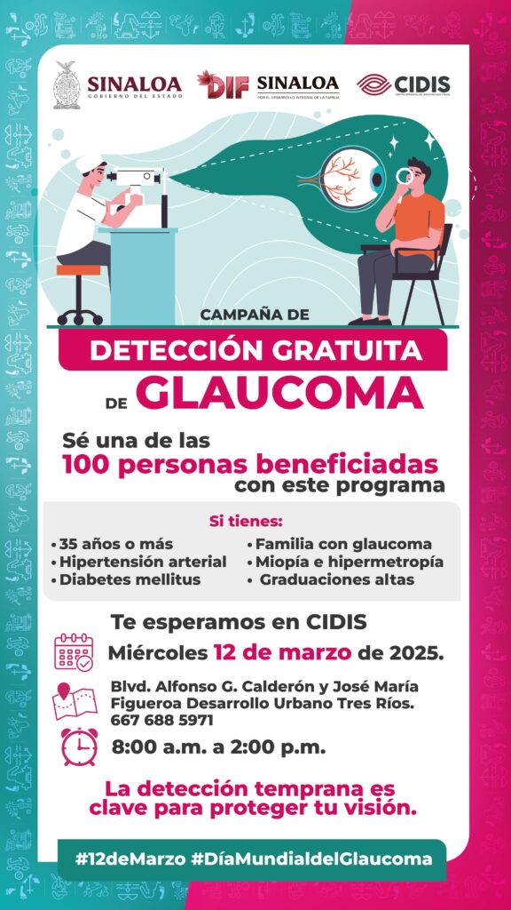 El glaucoma es una de las principales causas de pérdida de visión en el mundo y puede ser silencioso hasta etapas avanzadas, por lo que la detección temprana es fundamental para preservar la salud visual. Como parte del compromiso del Gobierno del Estado y DIF Sinaloa, se ofrecerán estudios gratuitos para identificar factores de riesgo y atender oportunamente a quienes lo necesiten.