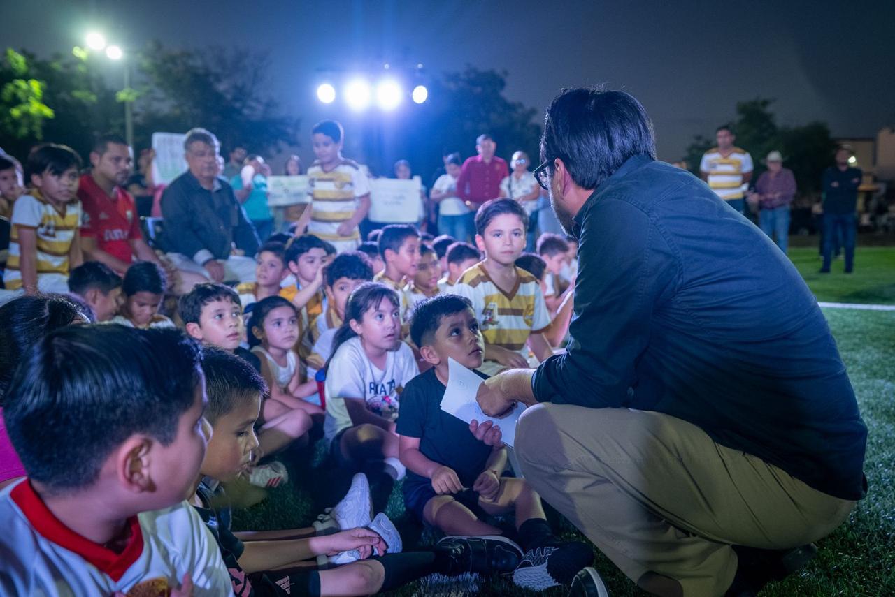 Culiacán, Sinaloa.- “Gracias porque ahora tendremos un mejor desarrollo deportivo y más rendimiento”, expresaron los niños integrantes del equipo La Mazia al presidente municipal Juan de Dios Gámez Mendívil, al agradecerle por cumplir su palabra y regresar al parque del fraccionamiento La Conquista para entregarles su cancha de fútbol de pasto sintético, ya en óptimas condiciones.