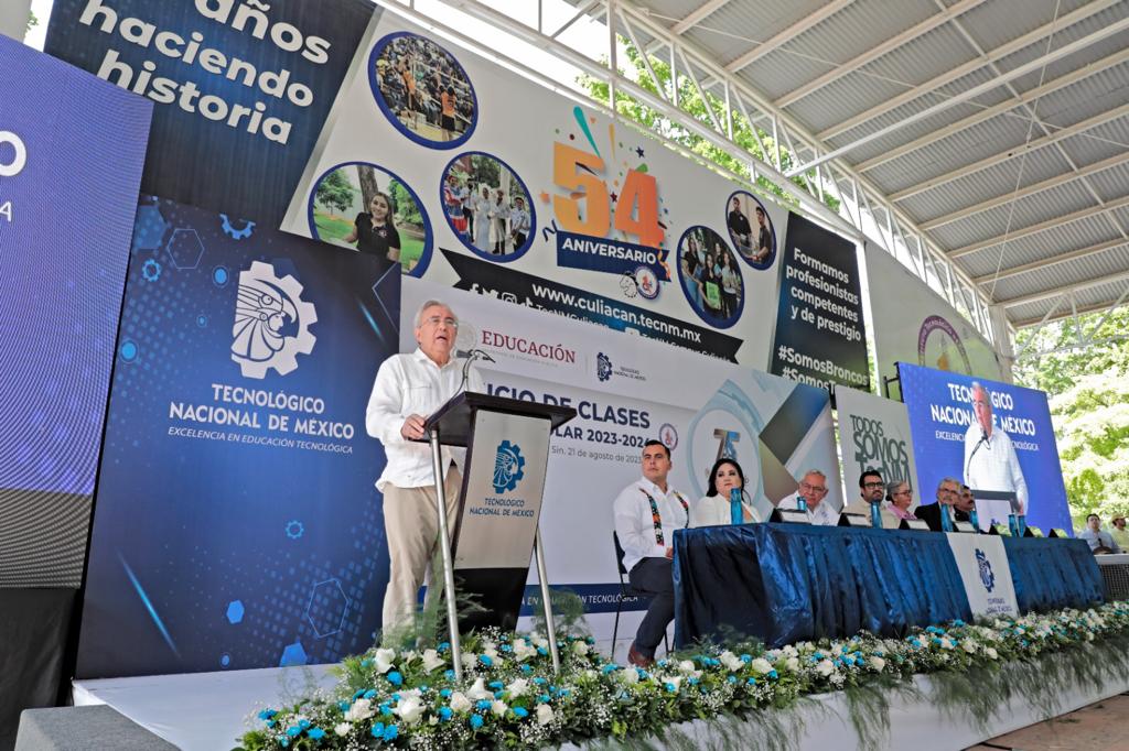 Culiacán, Sinaloa.- El gobernador Rubén Rocha Moya encabezó el arranque del ciclo escolar 2023-2024 del Instituto Tecnológico Nacional de México campus Culiacán acompañado del director general del TECNM Ramón Jiménez López, en donde dio la bienvenida a los estudiantes de nuevo ingreso y reconoció la labor de la institución educativa para el desarrollo y formación de ingenieros y profesionistas en la zona noroeste del país.