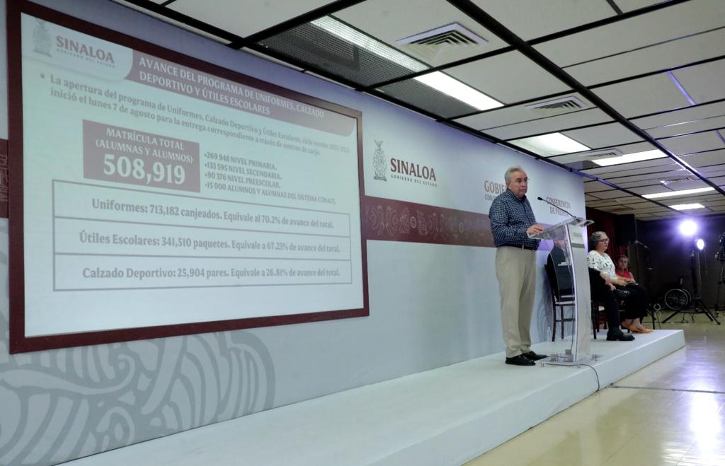 Culiacán, Sinaloa.- En el marco de la Semanera el Gobernador de Sinaloa Rubén Rocha Moya dio a conocer que en el arranque del nuevo ciclo escolar el canje del programa de Uniformes, Útiles y Calzado Escolar lleva un importante avance en la entrega de estos beneficio a las niñas, niños, padres de familias y tutores.