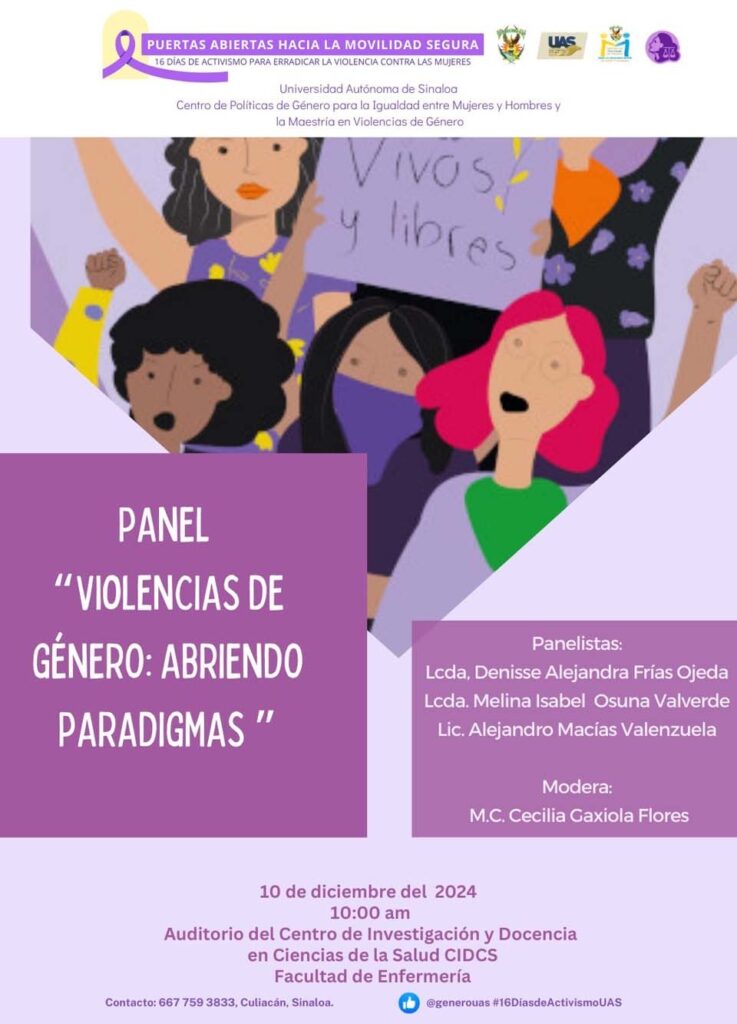 En el marco del Día Internacional de los Derechos Humanos, estudiantes de la Maestría en Violencia de Género que el Centro de Políticas de Género para la Igualdad entre Mujeres y Hombres (CPGIMH) de la Universidad Autónoma de Sinaloa (UAS) oferta, participaron en el panel “Violencias de Género: Abriendo Paradigmas” en la Facultad de Enfermería Culiacán, como para de la Jornada 16 Días de Activismo para Erradicar la Violencia contra las Mujeres, este martes 10 de diciembre.