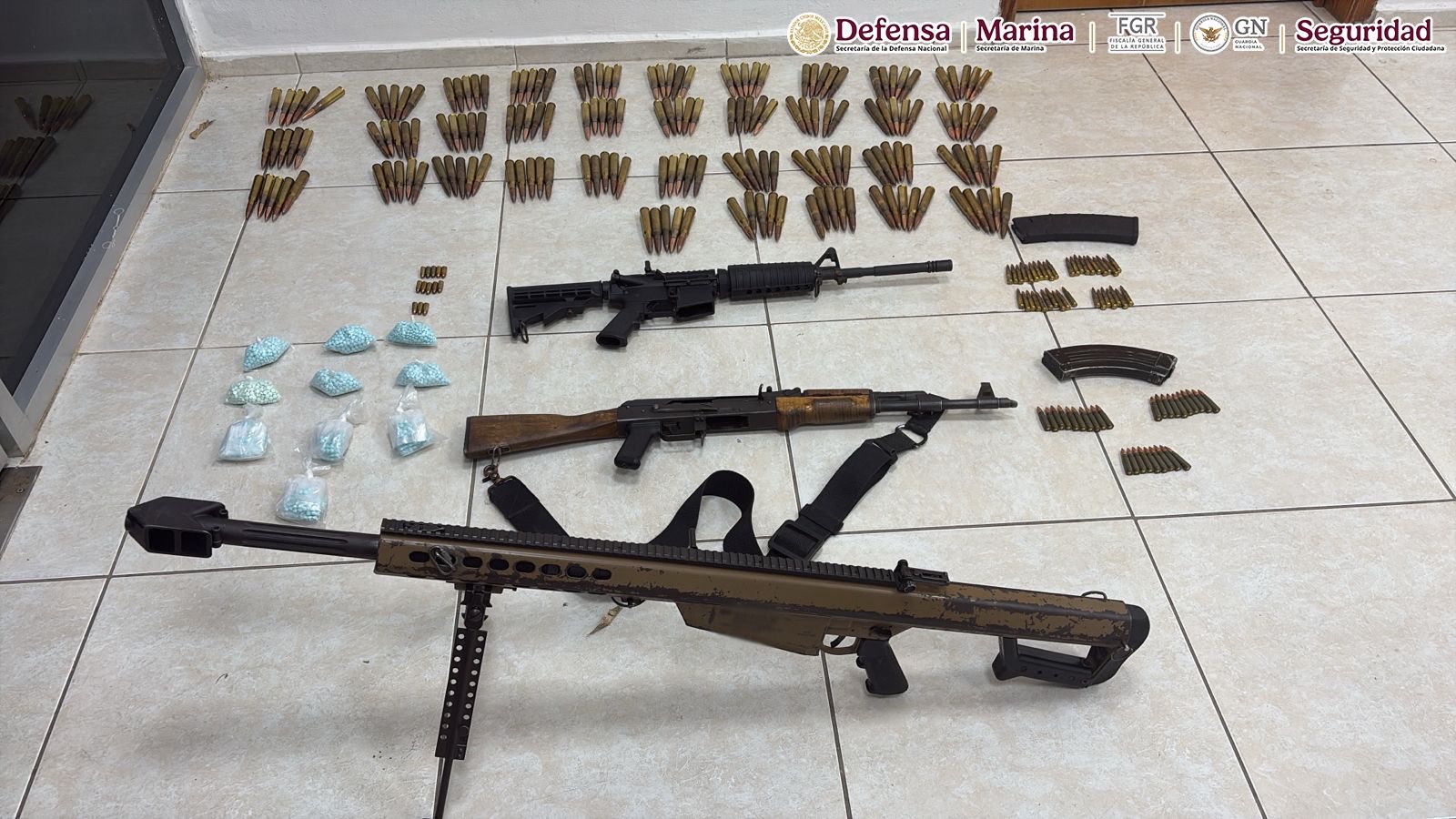 Para prevenir alguna conducta ilícita que pudiera poner en riesgo a la población, los efectivos les dieron alcance y detuvieron a los cinco hombres, uno de los cuales fue identificado como Horacio “N”. Tras efectuarles una revisión de seguridad, en apego a los protocolos de actuación, les hallaron tres armas largas, una de ellas un Barrett calibre 50, una mochila con 226 cartuchos útiles para arma larga, dos armas cortas y varias bolsitas con 250 gramos de pastillas de fentanilo.