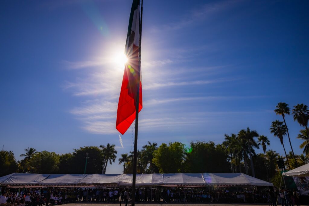 Luego del izamiento de la bandera monumental a cargo del gobernador del estado, correspondió a la secretaria de Educación Pública y Cultura, Gloria Himelda Félix Niebla, pronunciar el discurso oficial, donde después de hacer una reseña histórica del origen de la bandera nacional, destacó que hoy el mundo vive momentos de incertidumbre, la reconfiguración de un orden internacional que socava los cimientos de las relaciones entre los pueblos y los gobiernos, y que pretende alterar este modelo de convivencia poniendo en peligro una relación civilizada, de respeto y racional.