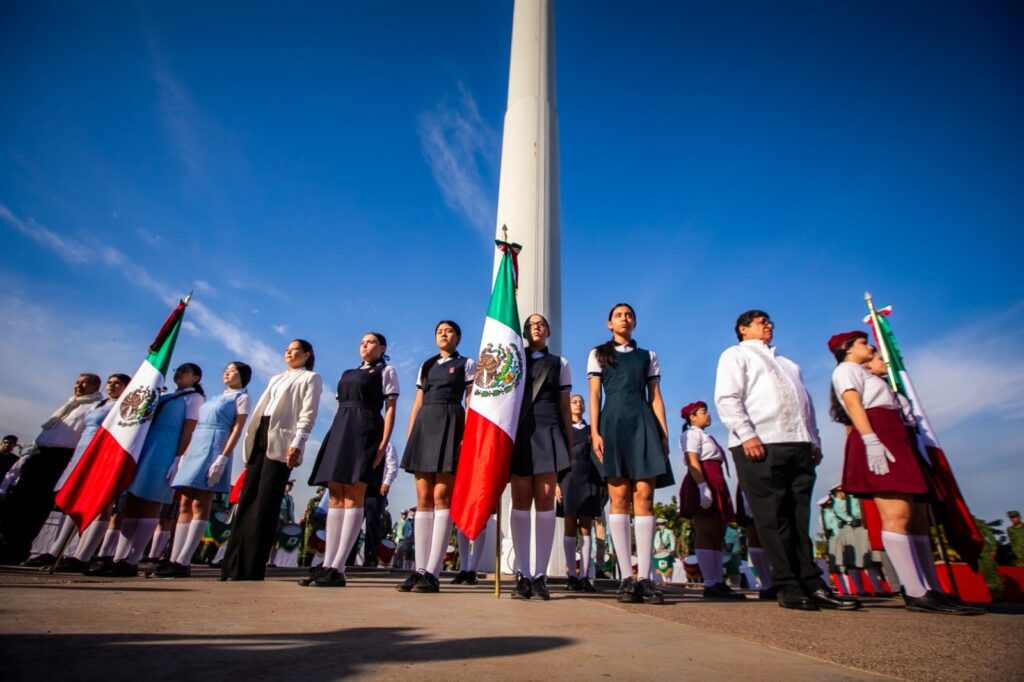“La Bandera de México como todo símbolo, es un emblema esencial útil para comunicarnos, por eso nuestra bandera es nuestra historia, pero también es nuestro presente, es el proceso de transformación que en estos momentos vive el país, la bandera nos hace pensar en México y pensar en el ejercicio de la política como un compromiso ético y humanista, nuestro desempeño diario, el apego irrestricto a la legalidad, la congruencia entre lo que decimos y hacemos, el símbolo patrio conlleva entonces el compromiso de este gobierno del Dr. Rubén Rocha Moya con la justicia social, el bienestar y los derechos humanos”, dijo.