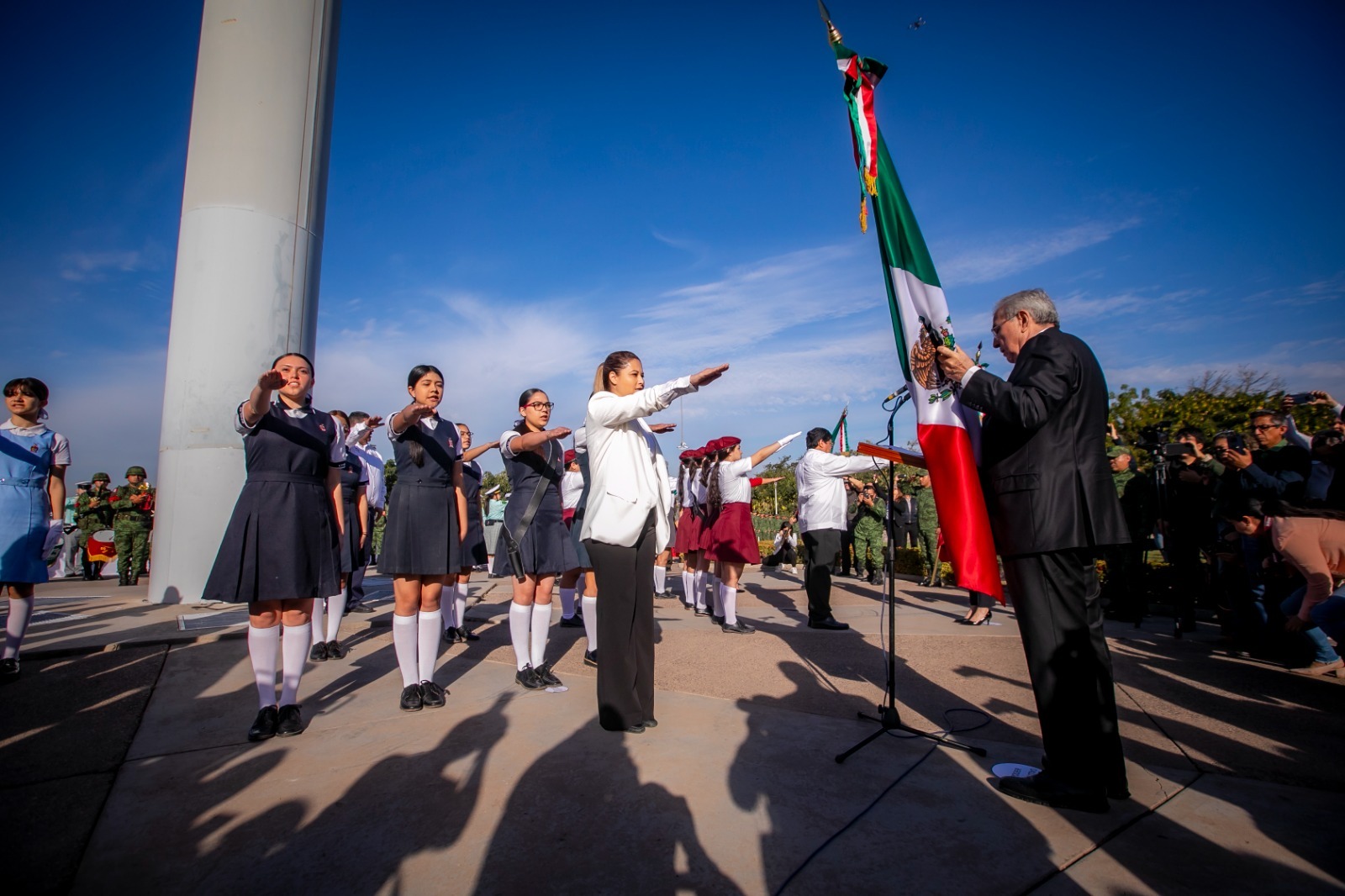 “La Bandera de México como todo símbolo, es un emblema esencial útil para comunicarnos, por eso nuestra bandera es nuestra historia, pero también es nuestro presente, es el proceso de transformación que en estos momentos vive el país, la bandera nos hace pensar en México y pensar en el ejercicio de la política como un compromiso ético y humanista, nuestro desempeño diario, el apego irrestricto a la legalidad, la congruencia entre lo que decimos y hacemos, el símbolo patrio conlleva entonces el compromiso de este gobierno del Dr. Rubén Rocha Moya con la justicia social, el bienestar y los derechos humanos”, dijo.