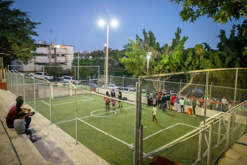 Esta rehabilitación consistió en la instalación de pasto sintético, caucho, así como cerca perimetral, reparación de porterías y colocación de lámparas LED que generan además de mejor visibilidad mayor seguridad para los jugadores.