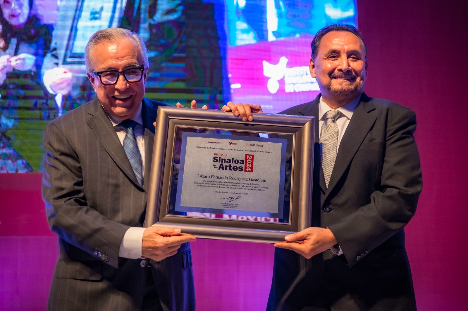 Agregando que, Lázaro Fernando es motivo de orgullo porque ha creado y recreado el patrimonio sinaloense, heredado de nuestros antepasados. «Hoy, apreciables amigas y amigos, tenemos el gusto de entregar el premio a una persona con una larga y brillante trayectoria, como director de teatro, actor, creador de espectáculos, docente, aguilista y como un incansable promotor cultural», puntualizó el Ejecutivo Estatal.