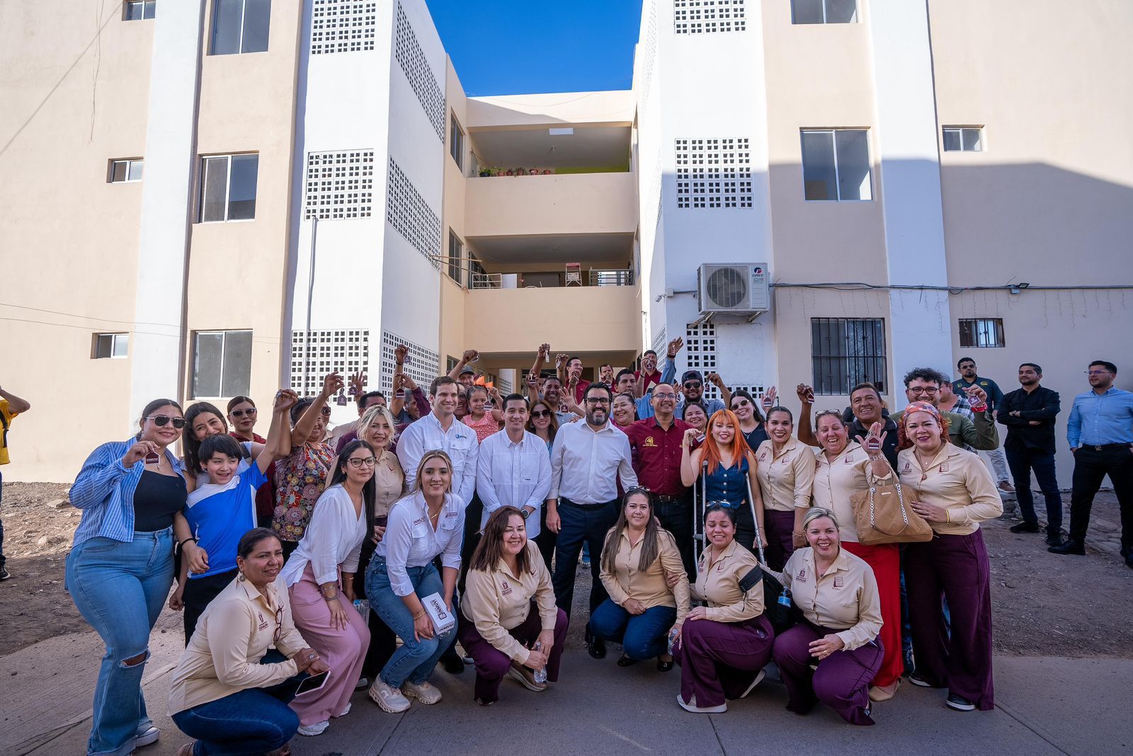 «De verdad aquí se demuestra la humanidad de nuestro alcalde Juan de Dios Gámez Mendívil, que por fin, de la mano de Roberto y de la mano de Lidia, nuestra compañera de la Secretaría de Vivienda del STASAC, por fin se pudo cristalizar el tema de los departamentos, una segunda entrega», afirmó.
