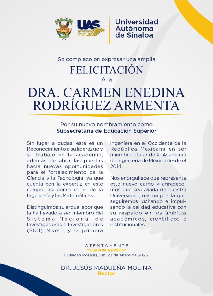 A través del Rector, doctor Jesús Madueña Molina, la Universidad Autónoma de Sinaloa (UAS) felicita a la doctora Carmen Enedina Rodríguez Armenta, por su nuevo nombramiento como Subsecretaria de Educación Superior de la Secretaría de Educación Pública Federal.