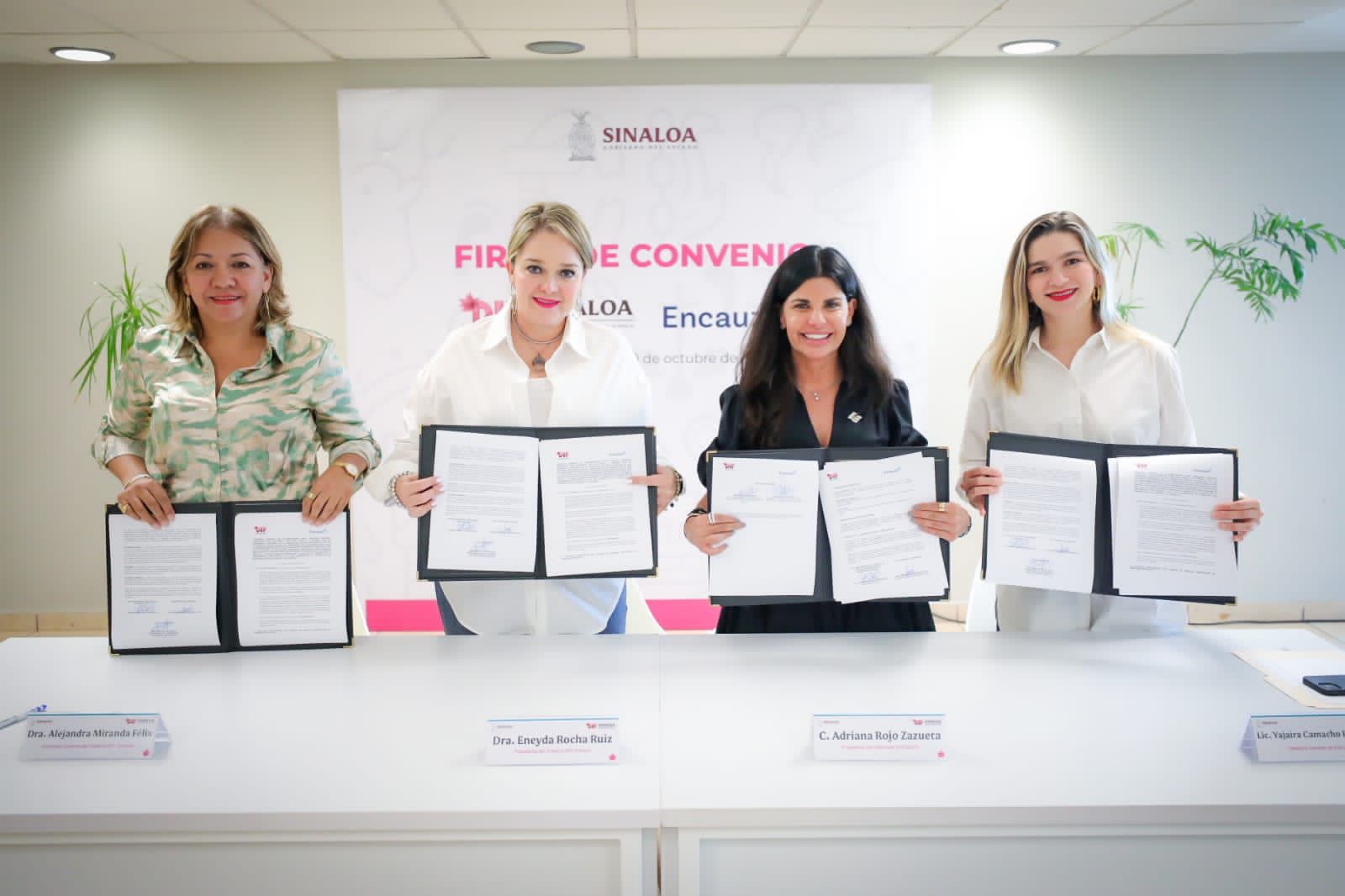 Culiacán, Sinaloa.- Con el propósito de continuar con la campaña de concientización de prevención del cáncer de mama, la doctora Eneyda Rocha Ruiz, Presidenta del Sistema DIF Sinaloa y la Lic. Adriana Rojo Zazueta, Presidenta del Fundación Encauza, firmaron convenio de colaboración con el cual busca llevar beneficios a más mujeres con asistencia médica, rehabilitación y atención en tratamiento de cáncer; promoviendo de manera general todos los estudios correspondientes a la detección, prevención oportuna del cáncer y otras enfermedades.