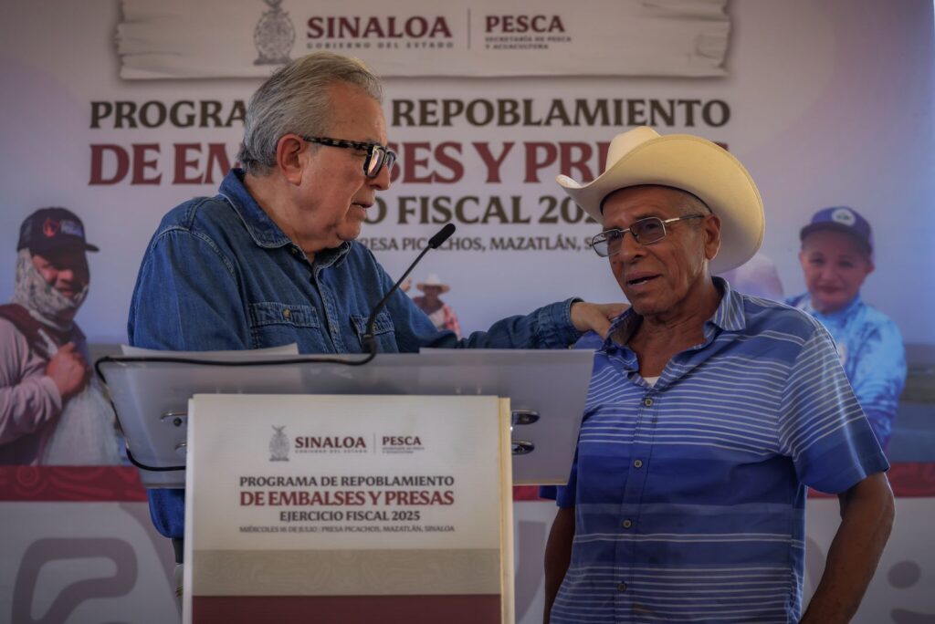 Presa Picachos, Mazatlán, Sinaloa.- En compañía de pescadores de diversas presas del estado, el gobernador Rubén Rocha Moya puso en marcha desde la presa Picachos, en la zona serrana del municipio de Mazatlán, el Programa de Repoblamiento de Presas y Embalses 2025, que consiste en el repoblamiento de 24.5 millones de alevines en las 12 presas que existen en el estado y diversos diques, ubicados en 12 municipios de Sinaloa, y que representa una inversión de 12 millones de pesos.