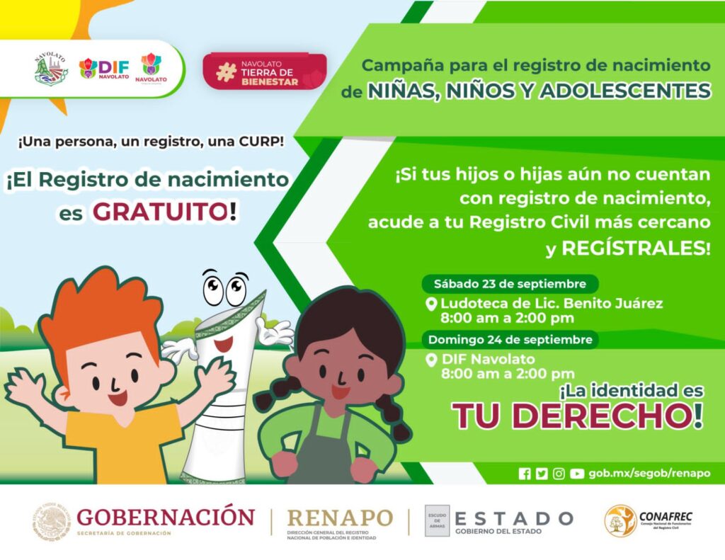 El Presidente del Sistema DIF Navolato, Sergio Uriel Barraza Urrea, invita a la Campaña para el Registro de Nacimiento de Niñas, Niños y Adolescentes “La identidad es tu derecho”, que se llevará a cabo en coordinación con la Dirección del Registro Civil del Estado de Sinaloa el próximo sábado 23 de septiembre en la Ludoteca de la sindicatura Lic. Benito Juárez, y el domingo 24 de septiembre en las instalaciones del DIF Navolato, de 8 am a 2 pm.