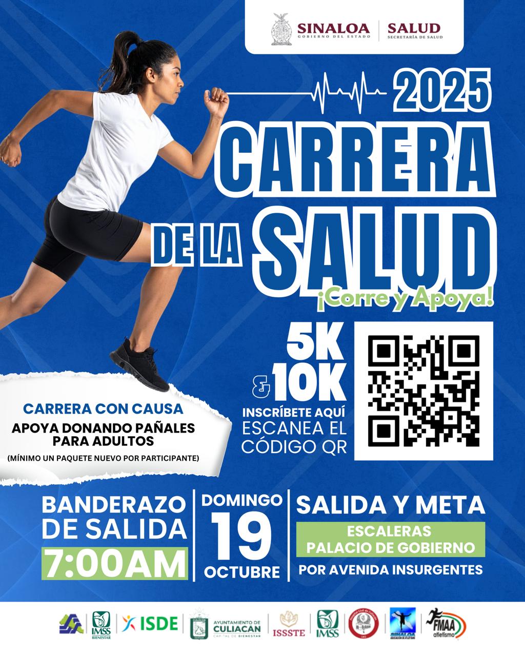 Culiacán, Sinaloa.- La Secretaría de Salud y Voluntariado Estatal invitan a toda la población a participar en la XXV Carrera de la Salud 2025 “Corre y Apoya”, la cual se llevará a cabo el próximo domingo 19 de octubre en punto de las 7:00 horas teniendo como salida y meta el edificio de Palacio de Gobierno, por la avenida Insurgentes. Los participantes que se inscriban a esta convocatoria deberán llevar pañales para adultos.