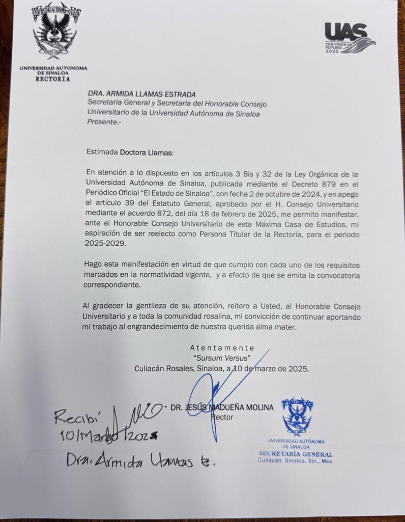 La Secretaria General y Secretaria del Consejo Universitario, doctora Armida Llamas Estrada, recibió el documento el cual precisa que “en atención a lo dispuesto en los artículos 3 Bis y 32 de la Ley Orgánica de la Universidad Autónoma de Sinaloa, publicada mediante el Decreto 879 en el Periódico Oficial El Estado de Sinaloa, con fecha 2 de octubre de 2024, y en apego al artículo 39 del Estatuto General, aprobado por el H. Consejo Universitario mediante el acuerdo 872, del día 18 de febrero de 2025” el doctor Madueña Molina manifiesta su aspiración de ser reelecto como Persona Titular de la Rectoría para el periodo 2025-2029.