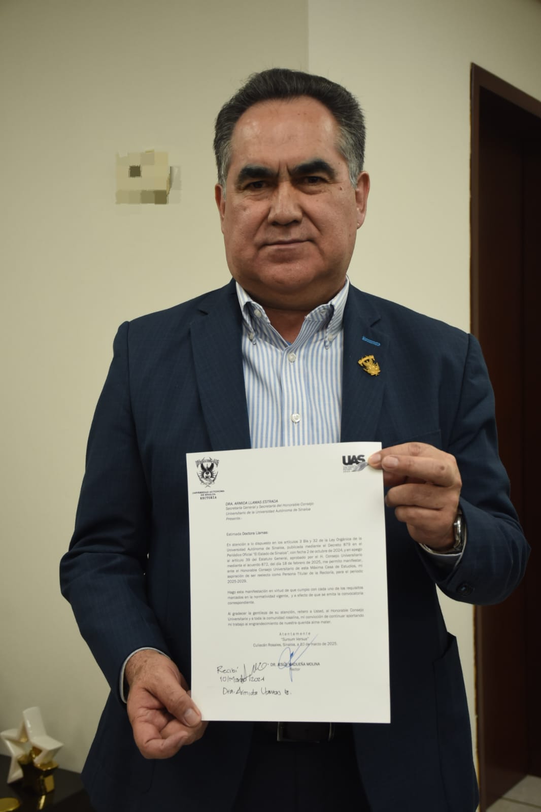 La Secretaria General y Secretaria del Consejo Universitario, doctora Armida Llamas Estrada, recibió el documento el cual precisa que “en atención a lo dispuesto en los artículos 3 Bis y 32 de la Ley Orgánica de la Universidad Autónoma de Sinaloa, publicada mediante el Decreto 879 en el Periódico Oficial El Estado de Sinaloa, con fecha 2 de octubre de 2024, y en apego al artículo 39 del Estatuto General, aprobado por el H. Consejo Universitario mediante el acuerdo 872, del día 18 de febrero de 2025” el doctor Madueña Molina manifiesta su aspiración de ser reelecto como Persona Titular de la Rectoría para el periodo 2025-2029.