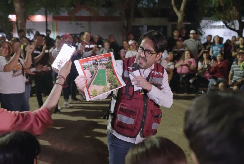 Durante la reunión, llevada a cabo en la unidad deportiva de este sector, Gámez Mendívil hizo el compromiso público para la rehabilitación integral de este espacio público, a través de la construcción de una cancha de futbol con pasto sintético, para que las niñas, niños y jóvenes de la colonia tengan un lugar digno donde practicarlo.