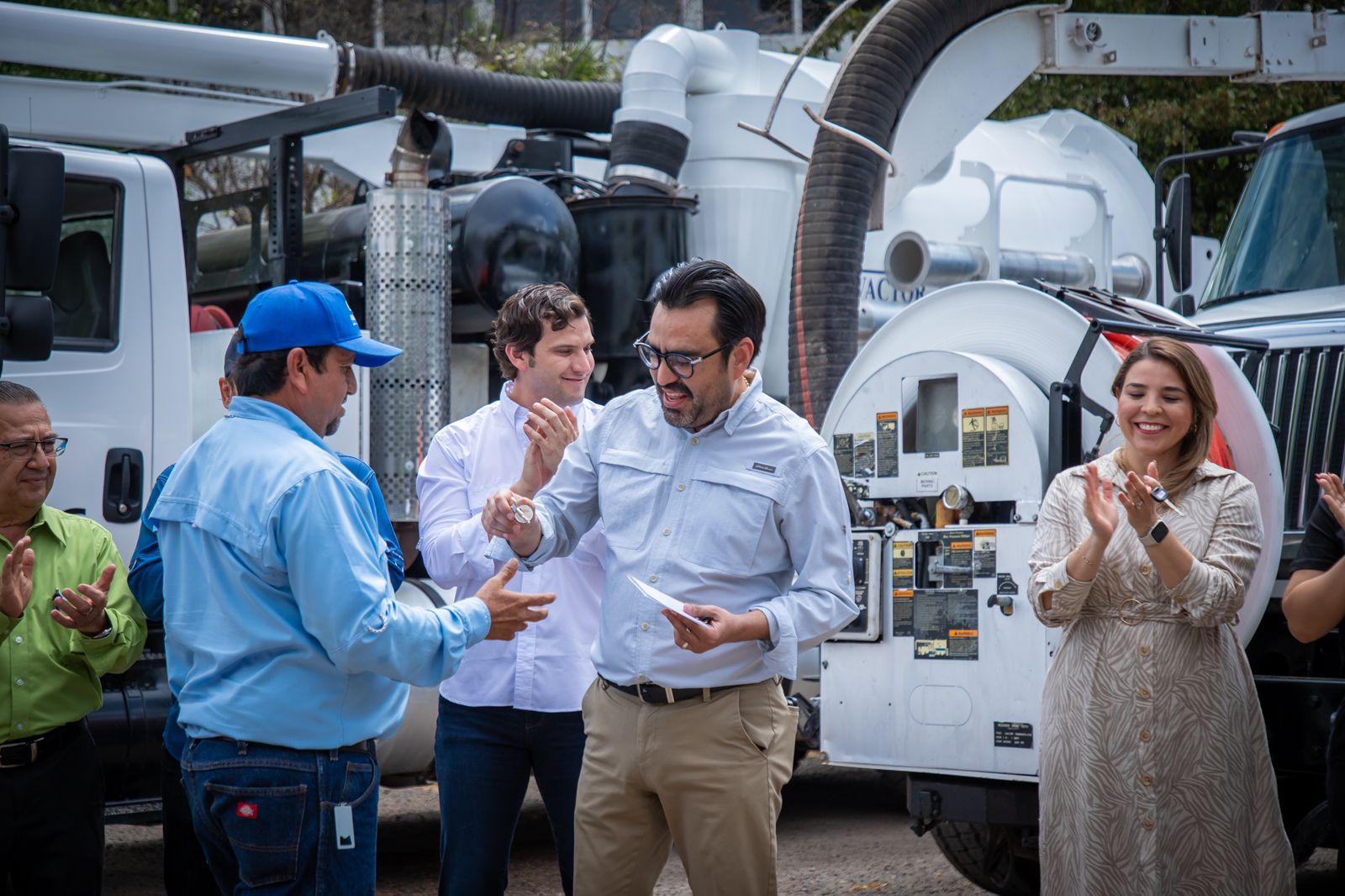 Culiacán, Sinaloa.- Para fortalecer las labores de limpieza y desazolve de las redes de alcantarillado sanitario de la ciudad, el alcalde Juan de Dios Gámez Mendívil, hizo entrega de tres camiones vactor a la Junta Municipal de Agua Potable y Alcantarillado de Culiacán, con una inversión conjunta que supera los 12 millones de pesos.
