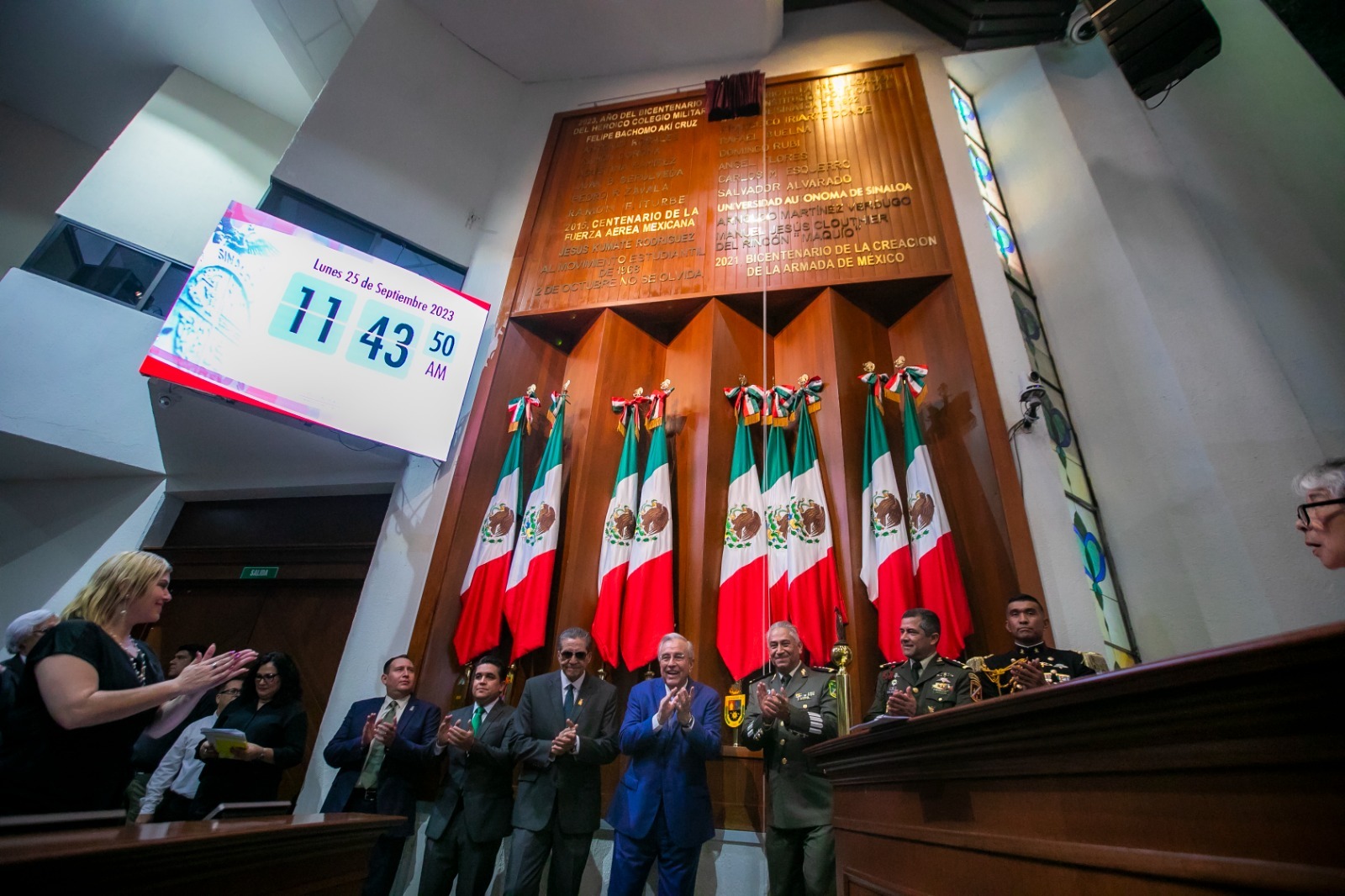 Culiacán, Sinaloa.- Como un merecido y justo reconocimiento a la institución más respetada y apreciada por los mexicanos por su aportación con cuadros calificados técnica, teórica y cívicamente a las fuerzas armadas de la nación, calificó el Gobernador Rubén Rocha Moya la develación de la Inscripción en Letras Doradas de la Leyenda «2023, Año del Bicentenario del Heroico Colegio Militar», al acudir este lunes a la Sesión Solemne del H. Congreso del Estado de Sinaloa con este motivo, acto al que también asistieron como invitados de honor el General de División D. E. M. Francisco Jesús Leana Ojeda, Comandante de la Tercera Región Militar y Jesús Iván Chávez Rangel, Presidente del Supremo Tribunal de Justicia del Estado.