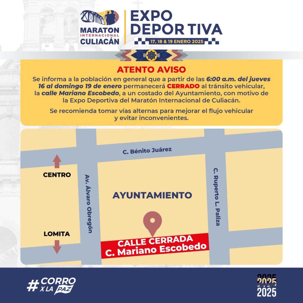Culiacán, Sinaloa.- Para salvaguardar a asistentes y participantes del Maratón Internacional Culiacán, la Secretaría de Seguridad Pública y Tránsito Municipal informa el cierre de circulación en los tramos de la calle Mariano Escobedo entre Obregón y Paliza, así como el de la Álvaro Obregón de la Hidalgo a la Colón.