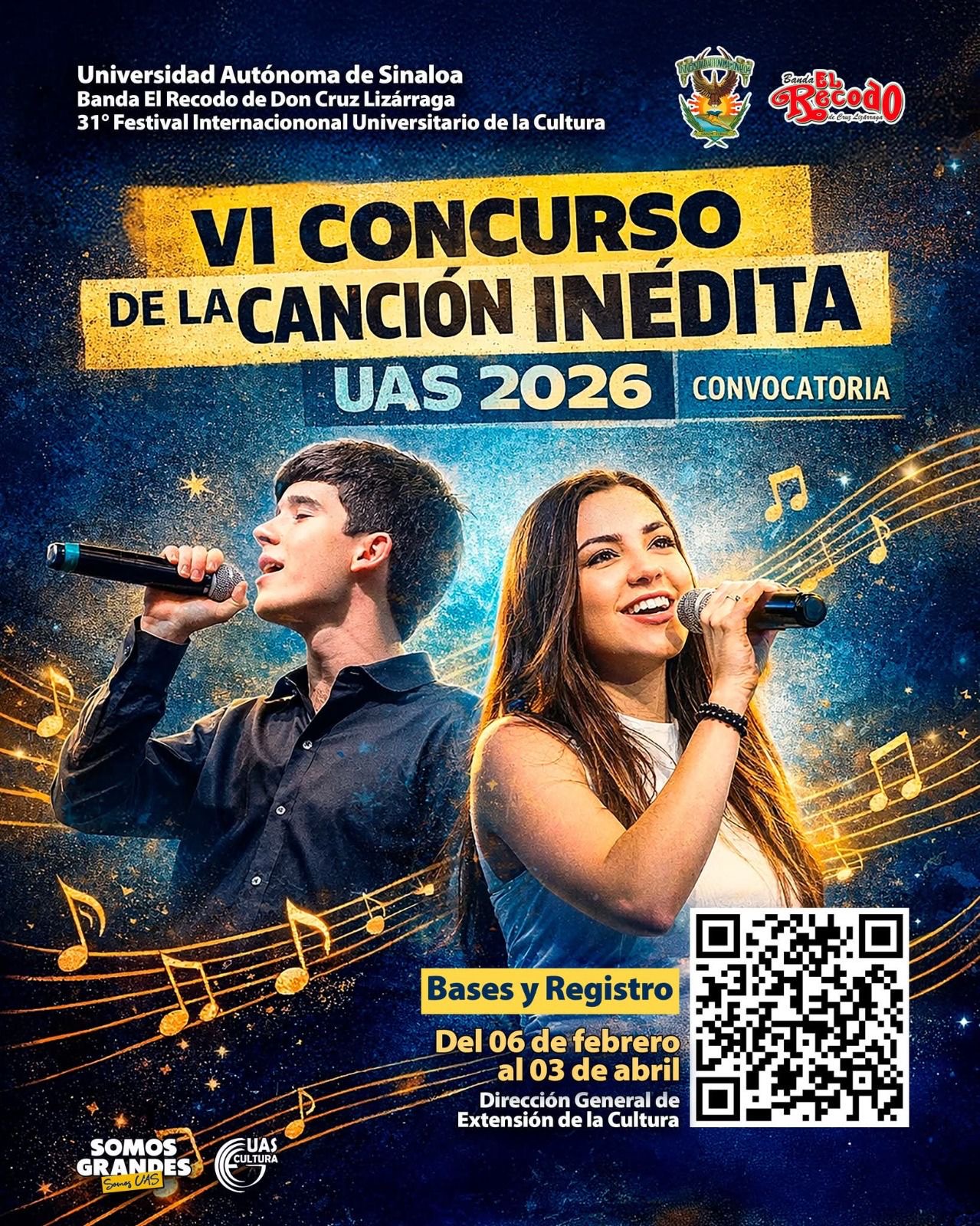 La Universidad Autónoma de Sinaloa (UAS), a través de la Dirección General de Extensión de la Cultura, convoca a los alumnos de esta casa de estudios y a compositores del estado de Sinaloa a participar en las nuevas ediciones de los concursos: Canción Ranchera UAS 2026 y Canción Inédita UAS 2026 (género libre).