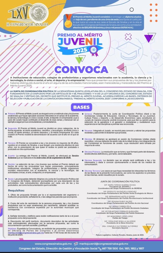 Culiacán, Sinaloa.-El Congreso del Estado de Sinaloa convoca a jóvenes a participar en el “Premio al Mérito Juvenil 2025”, que se otorga a quienes hayan ejecutado acciones relevantes en la academia, la ciencia y la tecnología, lo cívico o social, el arte, el deporte o lo empresarial y que a juicio del Jurado hayan contribuido al desarrollo de esas ramas y merezcan ser un ejemplo a seguir.