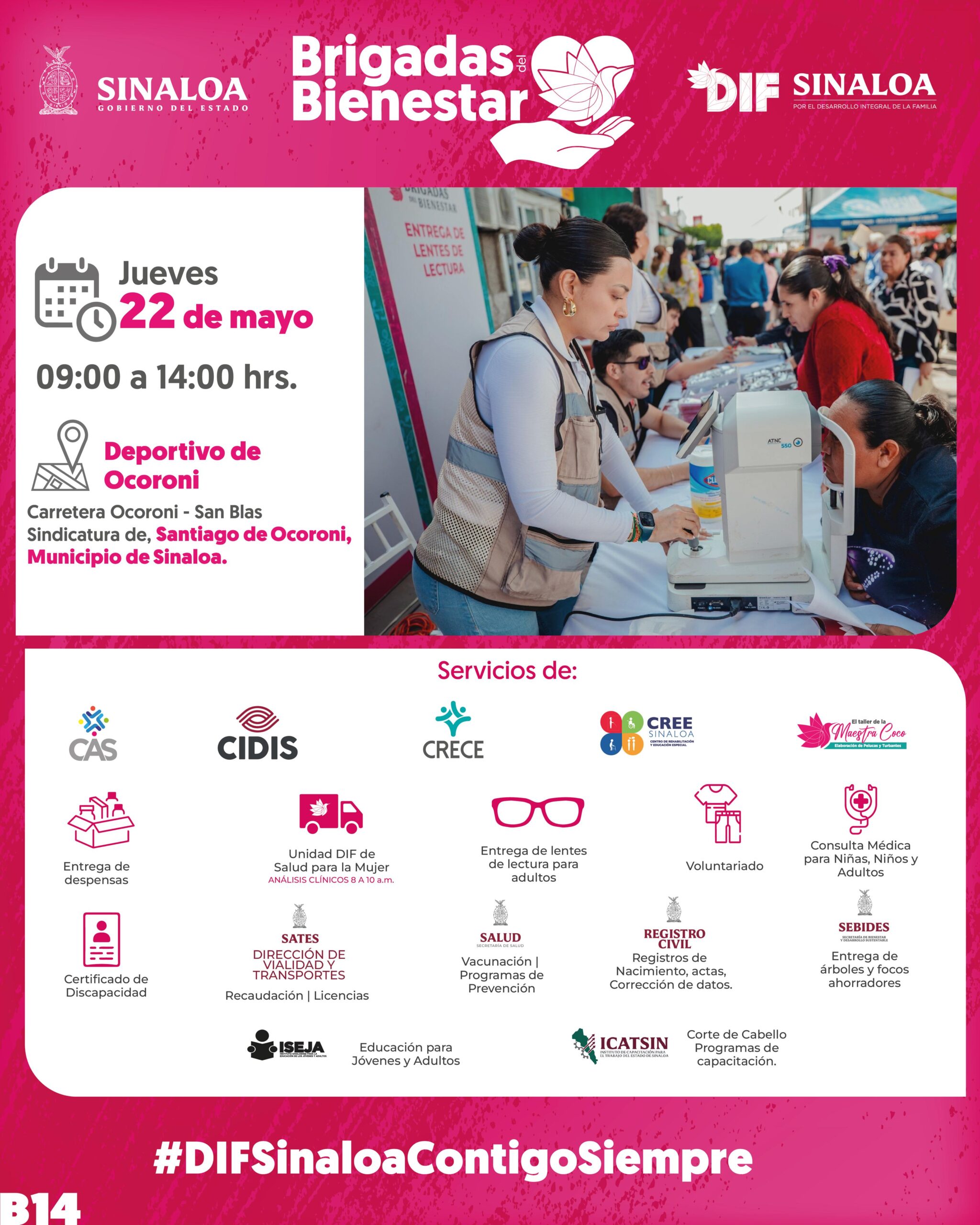 La Brigada del Bienestar está programada para el jueves 22 de mayo en horario de 9 de la mañana a 2 de la tarde, se desarrollará en el Polideportivo que se encuentra ubicado por la Carretera a San Blas en la Sindicatura de Santiago de Ocoroni, municipio de Sinaloa.
