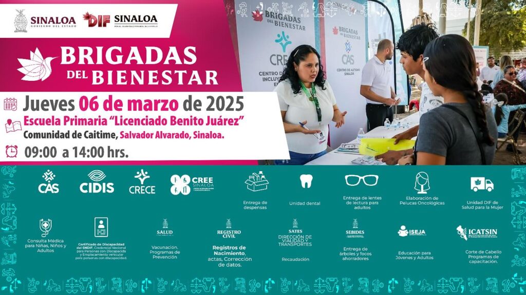 Culiacán, Sinaloa.-El Sistema DIF Sinaloa llevará su programa Brigadas del Bienestar a la comunidad de Caitime, Salvador Alvarado. Para que las familias aprovechen los servicios de salud, asistencia social y alimentaria que llevan a la ciudadanía de manera gratuita con el propósito de mejorar su calidad de vida y bienestar.
