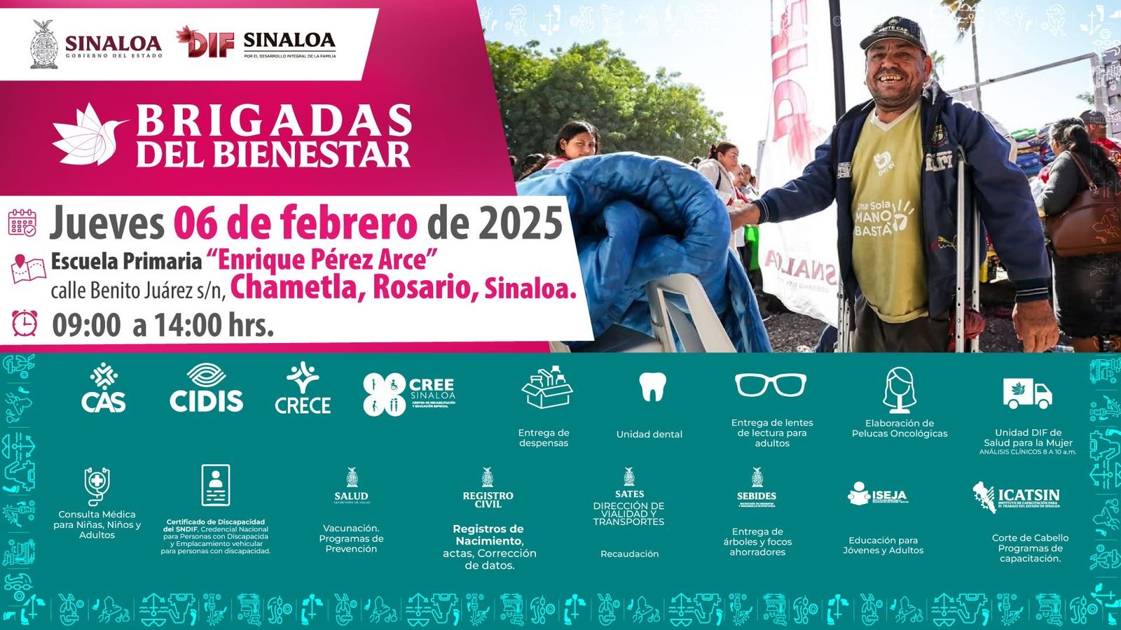 Este jueves 06 de febrero, las Brigadas del Bienestar de DIF Sinaloa, estarán en Chametla en el municipio de Rosario en la Escuela Primaria “Enrique Pérez Arce” ahí las familias podrán acceder a los servicios en un horario de 9:00 a 14:00 horas.