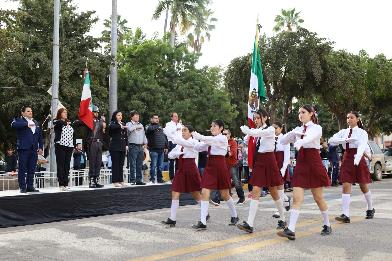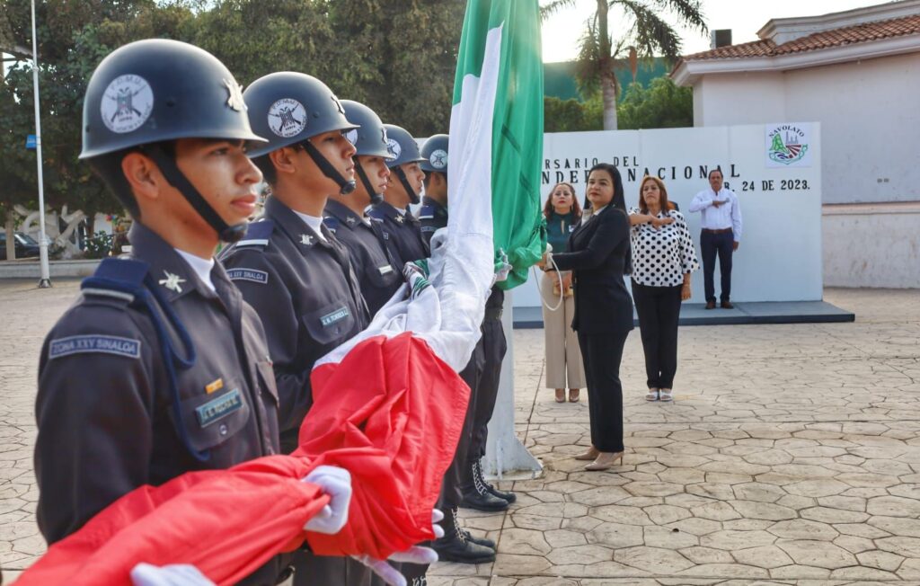 Navolato, Sinaloa.- La Presidenta Municipal de Navolato, Margoth Urrea Pérez, encabezó este jueves el Izamiento de bandera a toda asta en la explanada del Teatro del Pueblo, en conmemoración del 83 Aniversario de la Bandera Nacional.