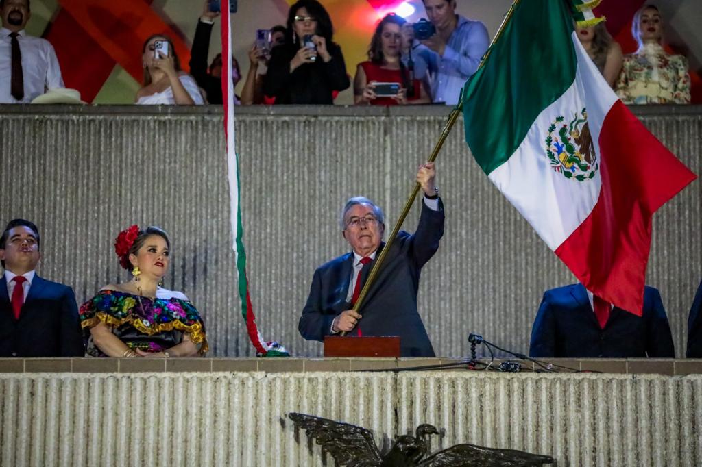 Minutos antes de la 11 de la noche, el gobernador del estado recibió la bandera nacional de manos de una escolta del 94 Batallón de Infantería de la Novena Militar, para inmediatamente dirigirse al balcón principal y dar el tradicional Grito de Independencia, para recordar el llamado que hiciera hace 213 años el cura don Miguel Hidalgo y Costilla.