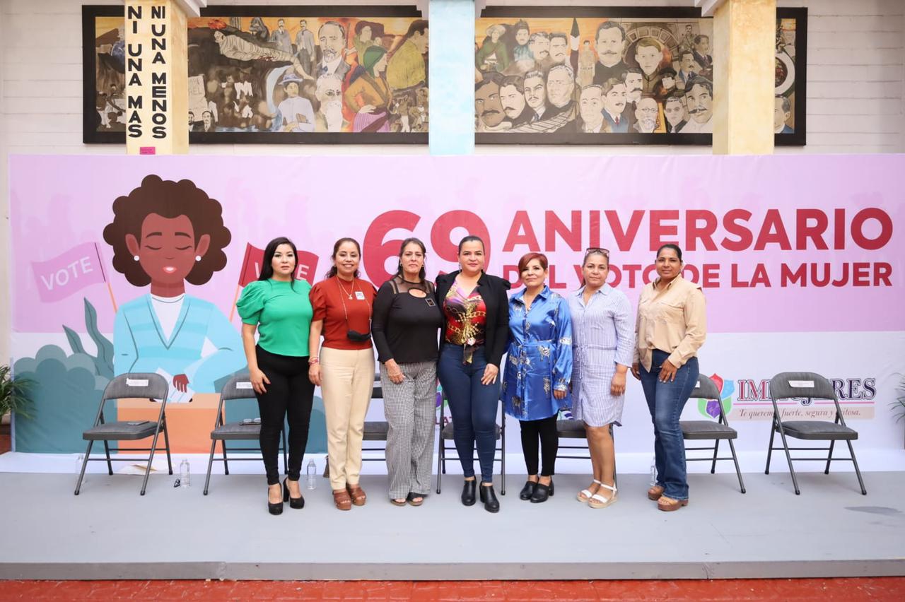 Navolato, Sinaloa.- Hoy lunes 17 de octubre en conmemoración del 69 Aniversario del Derecho al Voto de la Mujer en México, se llevó a cabo un encuentro de mujeres en el Patio del Ayuntamiento de Navolato, mismo que fue encabezado por la Alcaldesa Margoth Urrea Pérez, donde se realizó la ponencia “Derechos Humanos de las Mujeres y la Consolidación del Voto Femenino en México” por parte de la Lic. María Luz Obeso Alvarado de la Secretaría de Mujeres de Sinaloa.