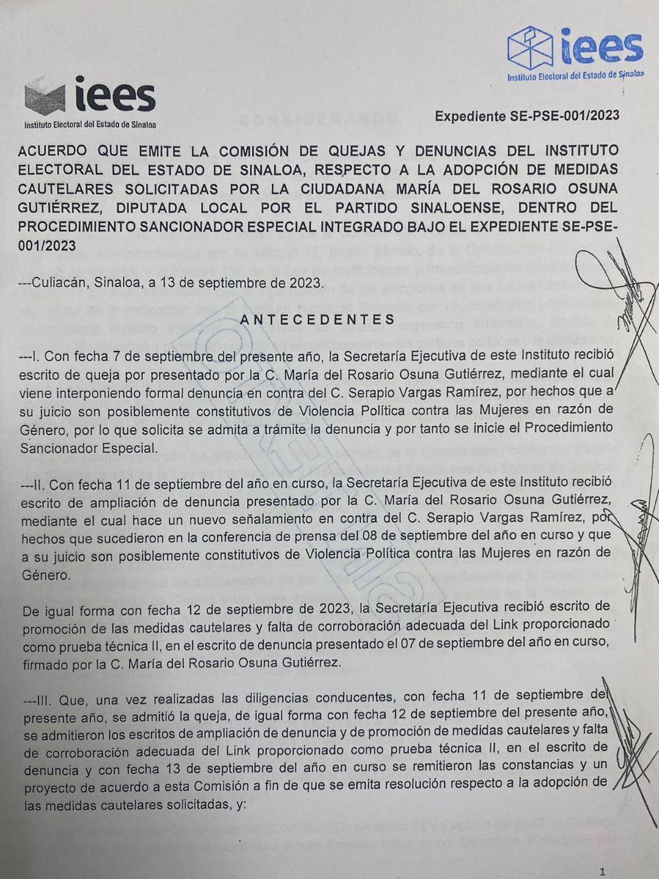 La Comisión de Quejas y Denuncias del Instituto Electoral del Estado de Sinaloa otorgó medias cautelares a favor de la Diputada del PAS María del Rosario Osuna Gutiérrez por la denuncia que presentó por posibles acciones de Violencia Política en Razón de Genero realizadas por parte del Diputado Serapio Vargas Ramírez en su contra.