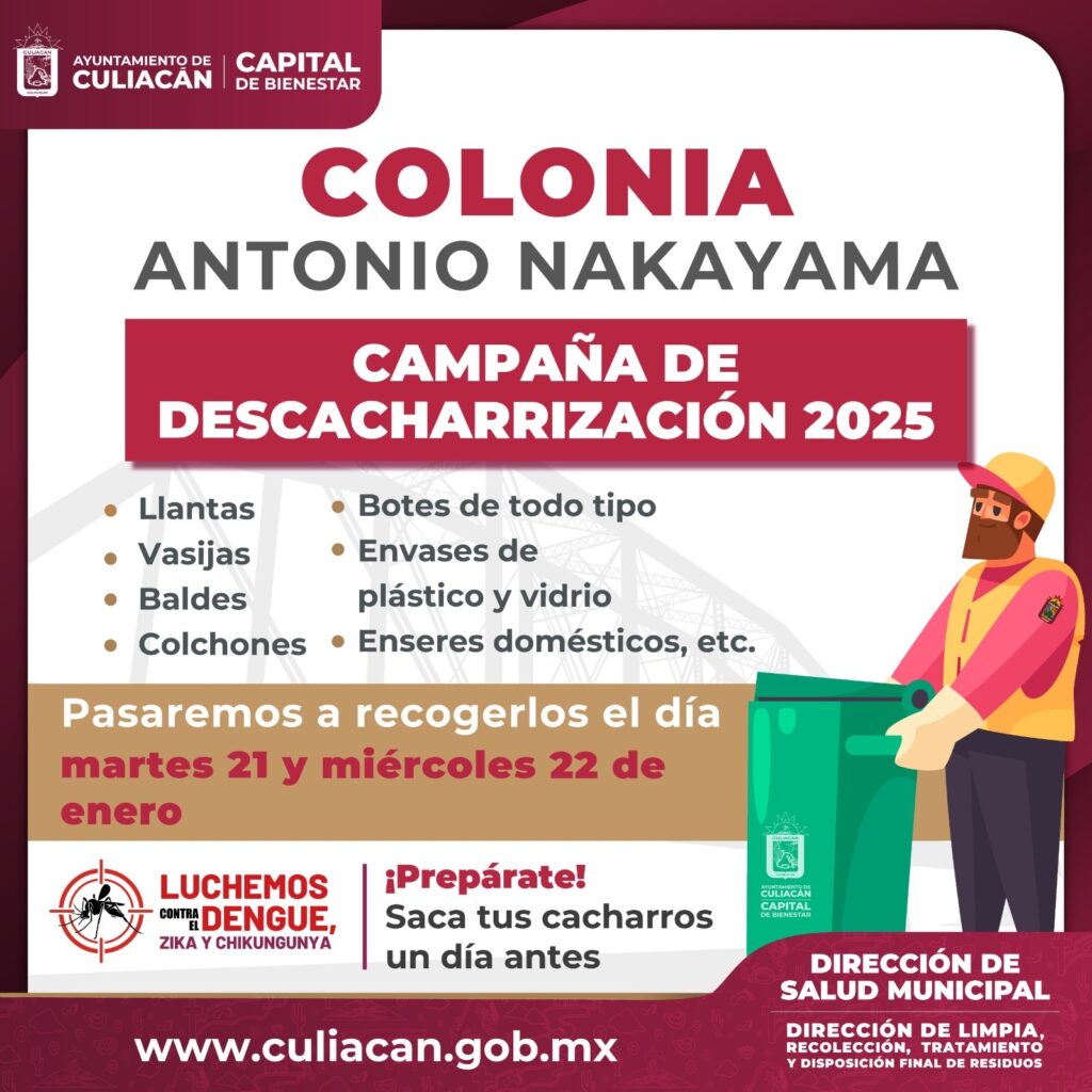 Culiacán, Sinaloa.- El Ayuntamiento de Culiacán continúa fomentando los espacios limpios y saludables mediante la Campaña de Descacharrización 2025, que se realizará este martes 21 y miércoles 22 de enero en la colonia Antonio Nakayama.