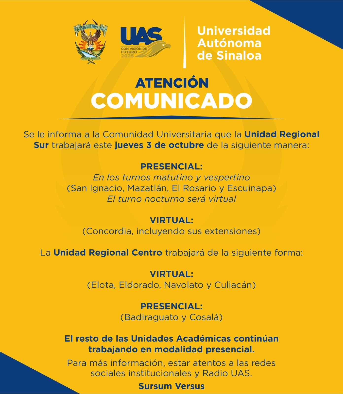 El encargado del Despacho de Rectoría de la UAS expresó que la medida que toma la Universidad no tiene otro afán más que salvaguardar la integridad de los alumnos, docentes, personal administrativo y los padres de familia, ya que con los hechos violentos de alto impacto que se suscitan en la ciudad es preocupante poner en riesgo a la comunidad universitaria.