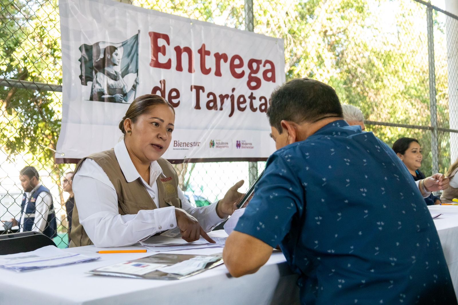 El delegado de los Programas para el Bienestar en Sinaloa, Ulises Piña junto al alcalde municipal Juan de Dios Gámez Mendivil, realizaron la entrega de tarjetas de banco del Bienestar a las pensiones Adulto Mayor y Mujeres Bienestar.