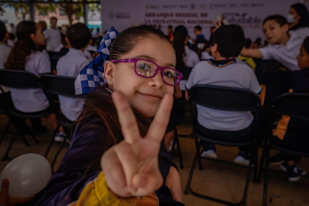 Culiacán, Sinaloa.- Ante la comunidad escolar de la primaria Eustaquio Buelna, una de las escuelas más antiguas y emblemáticas de Culiacán, el gobernador Rubén Rocha Moya puso en marcha en Sinaloa la Estrategia Nacional “Vive Saludable, Vive Feliz”, que se llevará a los más de 258 mil niñas y niños que cursan su educación primaria en todas sus modalidades.