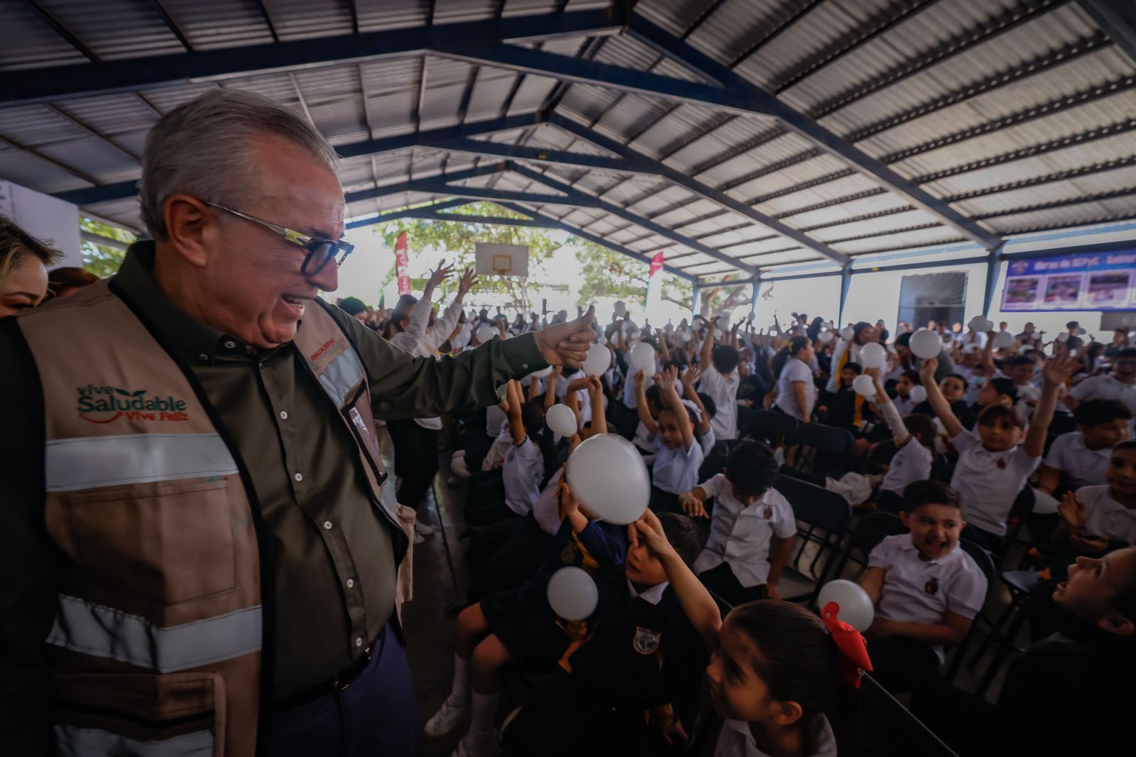 Culiacán, Sinaloa.- Ante la comunidad escolar de la primaria Eustaquio Buelna, una de las escuelas más antiguas y emblemáticas de Culiacán, el gobernador Rubén Rocha Moya puso en marcha en Sinaloa la Estrategia Nacional “Vive Saludable, Vive Feliz”, que se llevará a los más de 258 mil niñas y niños que cursan su educación primaria en todas sus modalidades.